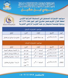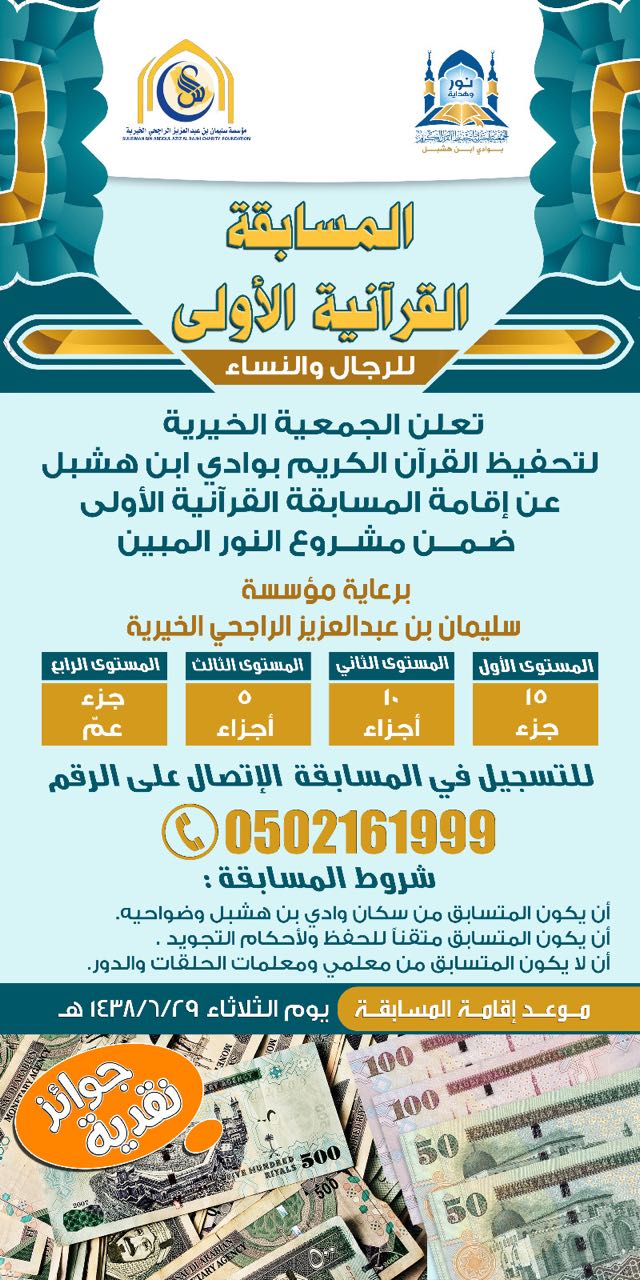 حدّدت #الجمعية_الخيرية_لتحفيظ_القرآن_الكريم_بوادي_بن_هشبل مواعيد اختبارات المسابقة القرآنية الأولى ضمن مشروع النور المبين برعاية مؤسسة سليمان بن عبدالعزيز الراجحي الخيرية , حيث تنطلق اختبارات البنين المسجلين في المسابقة يوم الثلاثاء الموافق 1438/6/29 هـ بجامع سراء بوادي ابن هشبل والبالغ عددهم 80 متسابق يتوزعون على فروع المسابقة ، وتنطلق اختبارات البنات يوم الأحد الموافق 1438/6/27 هـ في قطاع السليل وفي قطاع الحيمة و في قطاع وادي بن هشبل حيث بلغ عدد المسجلات في المسابقة ١٩٢ متسابقة يتوزعون على فروع المسابقة.