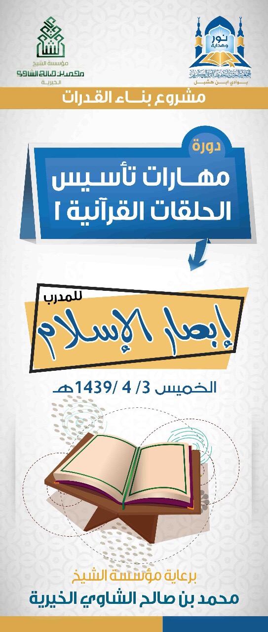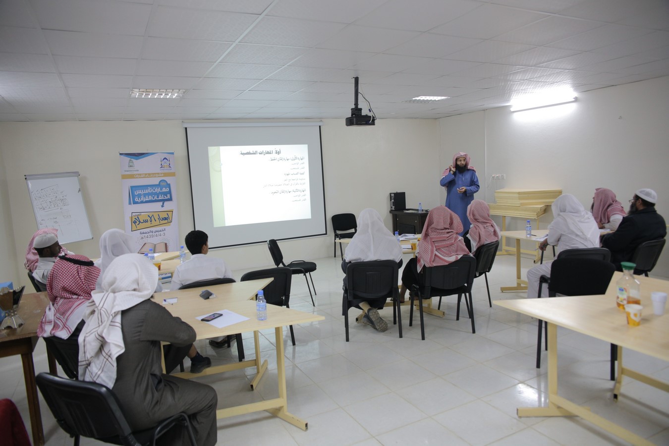 نظَّمت الجمعية يوميّ الخميس والجمعة الموافق 3 – 4 / 4 / 1439 هـ دورة تطويرية بعنوان ”مهارات تأسيس الحلقات القرآنية“ قدّمها مدرّب قسم الإجازات بالمسجد النبوي والمشرف التعليمي بحلقات المسجد النبوي سابقاً ومدرّب دورات إعداد معلّمي القاعدة النورانية المدرب / إبصار الإسلام , وبحضور 15 متدرّباَ من مشرفي ومعلمي الحلقات, ضمن مشروع (بناء القدرات) برعاية مؤسسة محمد بن صالح الشاوي الخيرية, والتي دامت يومين بمعدل 10 ساعات.